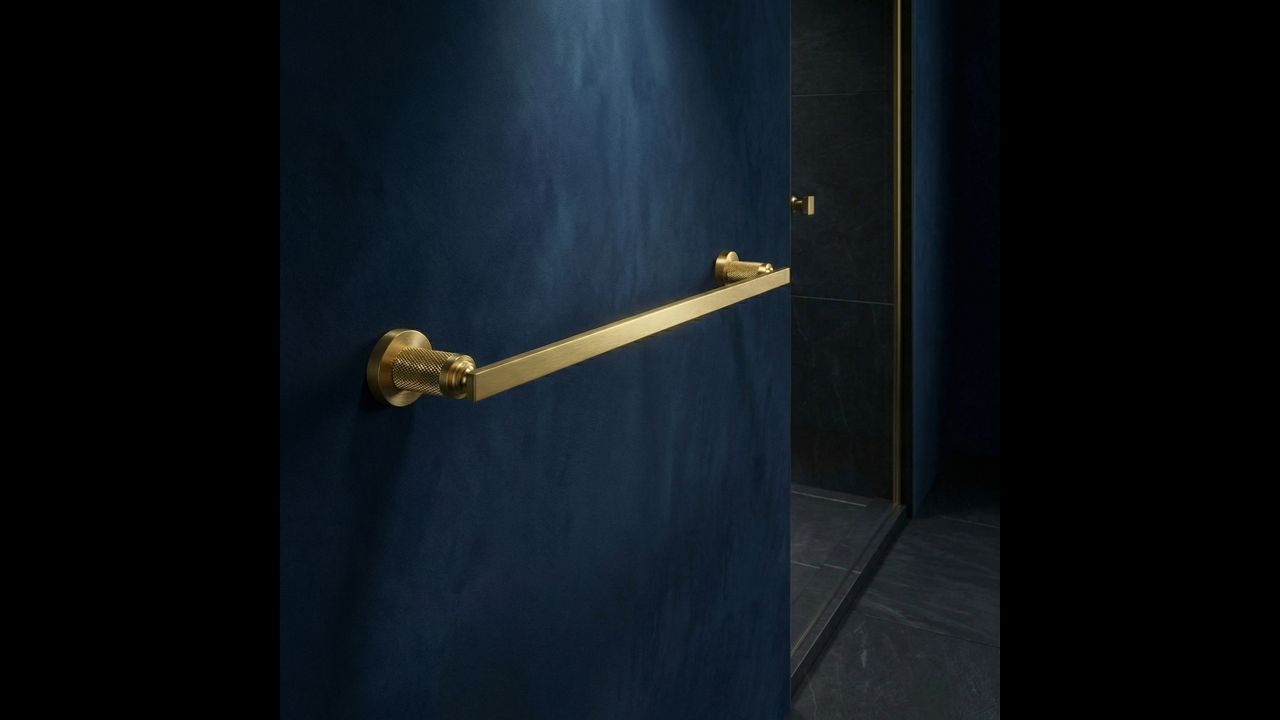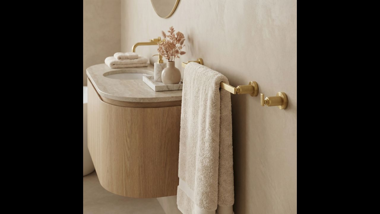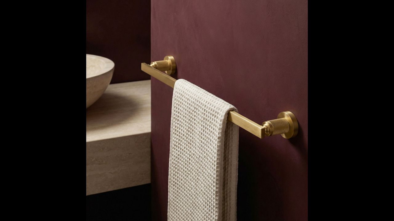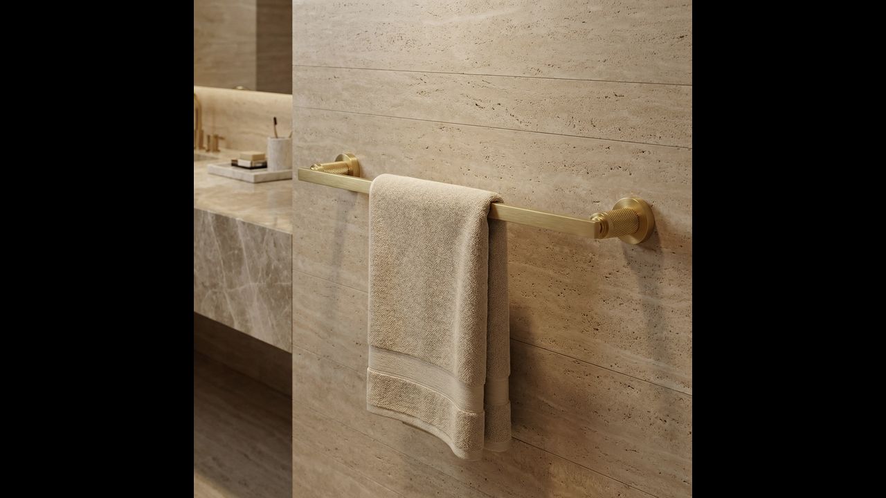 Pasirūpinkite elegantiška ir funkcionalia detale savo vonios kambaryje su vienos dalies „Rivo“ rankšluosčių laikikliu (šlifuoto aukso spalvos). Šis originalus modelis apjungia išraiškingą šiuolaikinę formą su klasika, sukuriant itin stilingą aksesuarą vonios zonai.
