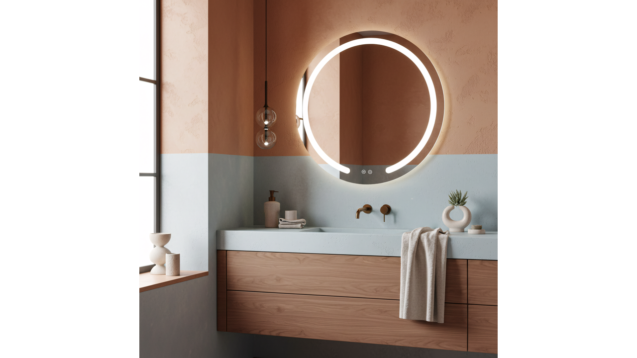 Apvalus vonios veidrodis iš Rea Modern serijos – stilingas ir funkcionalus šiuolaikinio vonios kambario akcentas. Šis modelis išsiskiria unikaliu dizainu su pieno spalvos LED rėmeliu, kuris apačioje yra nutrūkstantis, todėl forma atrodo lengvesnė ir modernesnė.